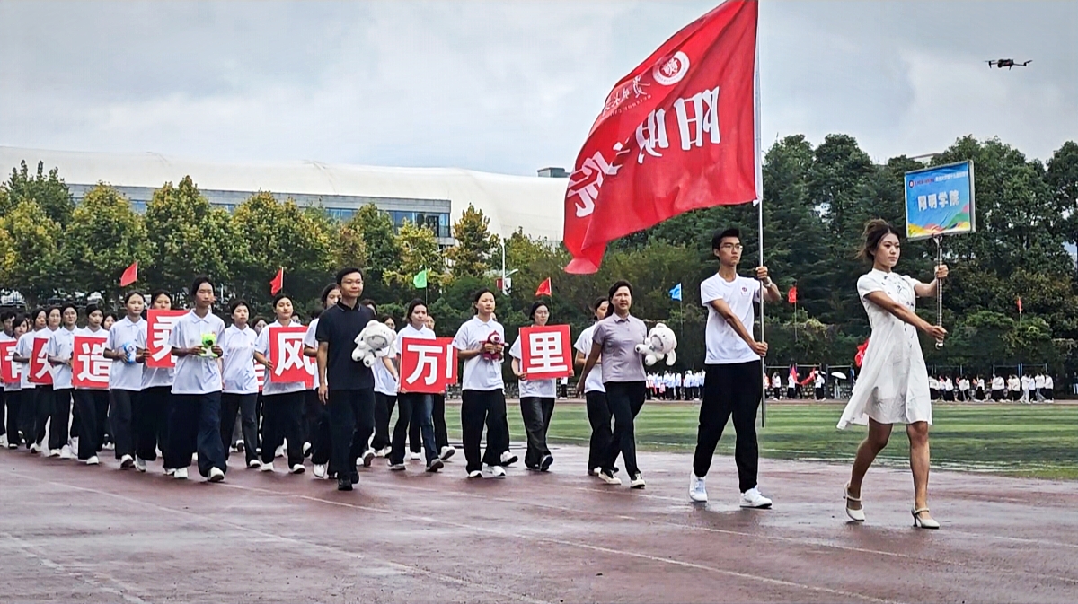 震撼鼓点与欢呼中,国旗护卫队、校旗队、彩旗队、裁判员队及各学院方阵依次入场,特色院服与创意队形尽显贵大学子朝气,呐喊“为运动而来”。