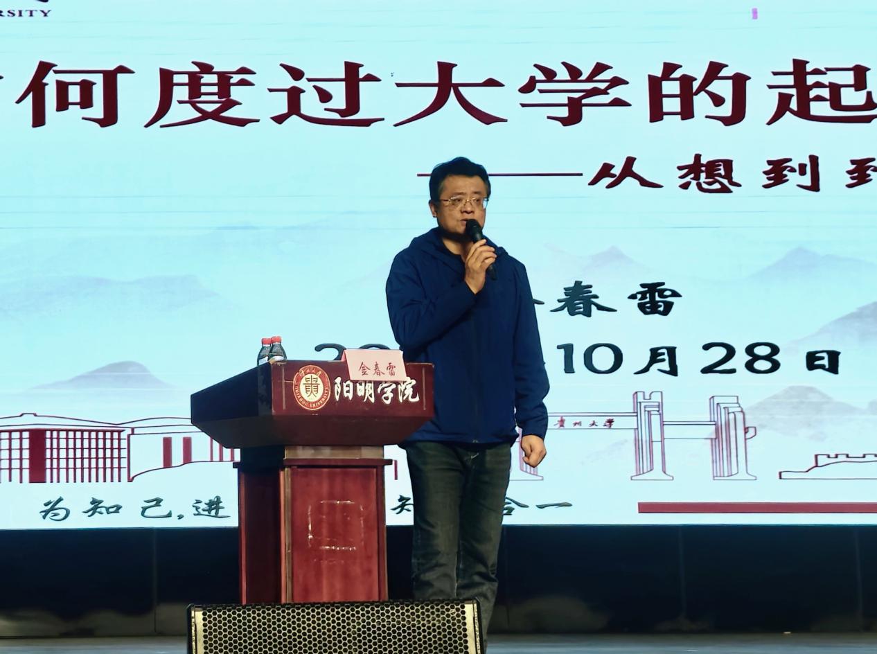 20251028日晚,“溪山论道·贵州大学阳明大讲坛”第169期暨红烛絮语·桑榆讲堂第2期在南校区大礼堂如期开讲。本次讲坛以“如何度过大学的起步阶段——从想到到做到”为主题,特邀贵州大学原烟草学院党委书记、教授金春雷担任主讲嘉宾。金教授长期深耕教育领域,主持及参与多项国家、省级科研项目,主编参编多部教材,发表学术论文数十篇,曾获评2021年贵州省教育工委精品党课主讲人、2024年贵州大学精品党课主讲人,兼具深厚理论积淀与丰富实践经验。讲座由贵州大学阳明学院正处级组织员叶明主持。阳明学院600余名学生代表现场聆听了报告。