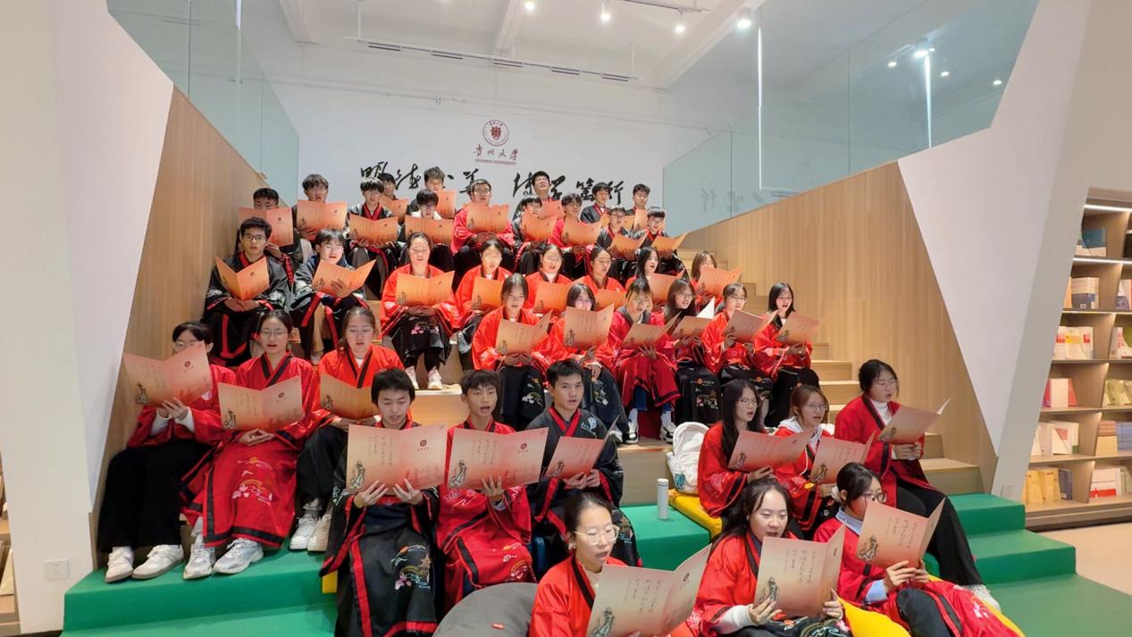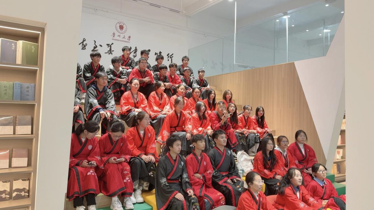 2025年10月27日下午2:30,在温暖的秋日阳光下,选修《王阳明与贵州文化》课程的同学们身着朱红色国学服装,走进贵州大学的阅读空间——贵州省新华书店·溪山书房。书房内,原木书架错落有致,典籍整齐陈列,泛着淡淡的光泽。空气中混合着墨香与草木的清新气息,窗外绿意盎然,光线透过枝叶,在书页间投下斑驳的影子。整个环境安静而雅致,为这场文化实践活动营造出恰如其分的氛围。在主持人周绮诗同学的开场介绍中,本课程在2025年秋冬学期的第一次实践研讨课程正式拉开序幕。