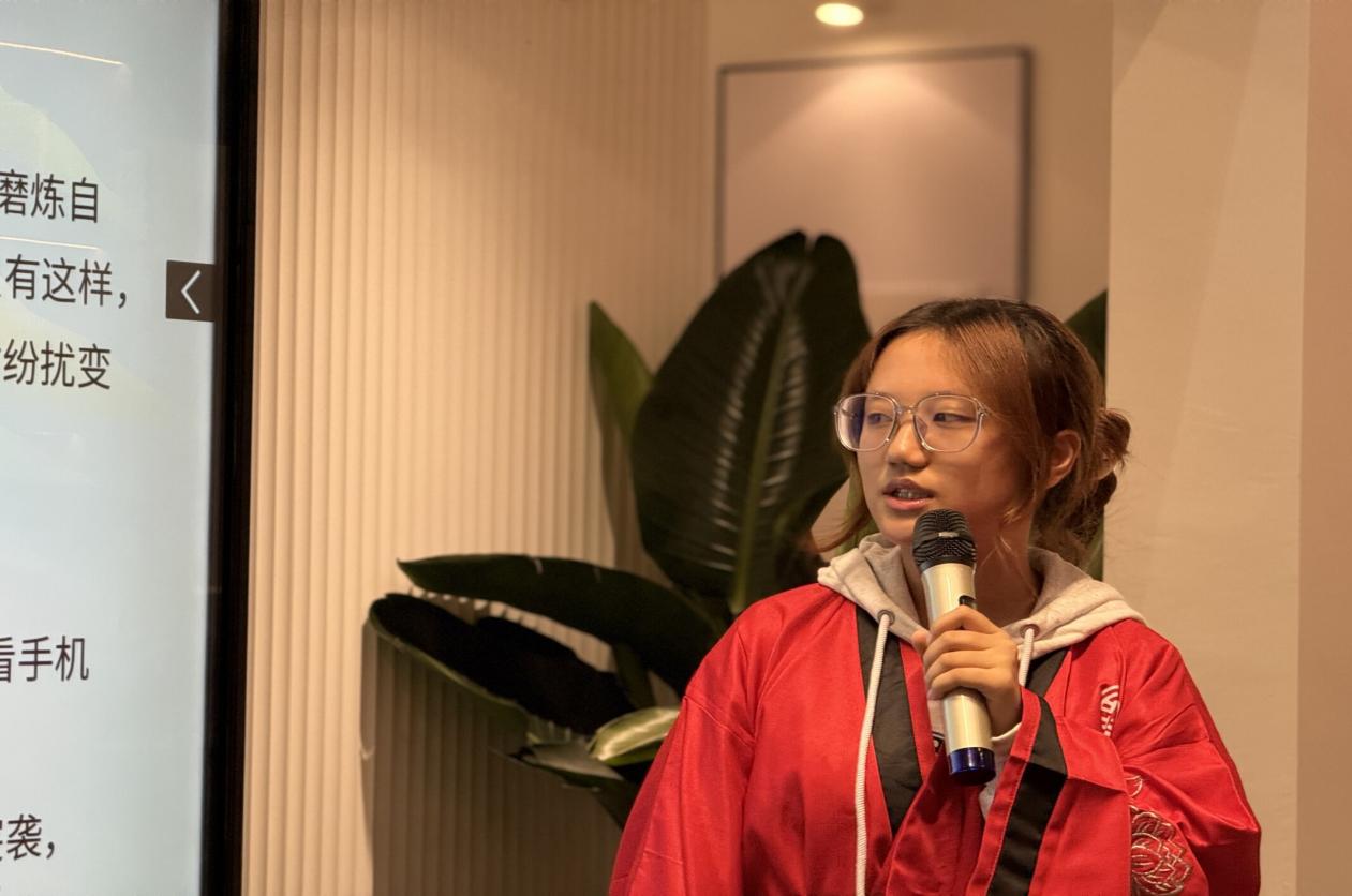 个人分享环节中,蒋漫宜弦同学以“王阳明名句解读”为主题进行了展示。她身着国学服,仪态自然,声音清晰。在分享中,她不仅解释了名句的含义,还结合自己的学习与生活体验,谈了对“志不立,天下无可成之事”“知行合一”等观点的理解。她的语言真诚而生动,既有对经典的尊重,也融入了年轻一代的视角,引起了同学们的共鸣,现场掌声不断。