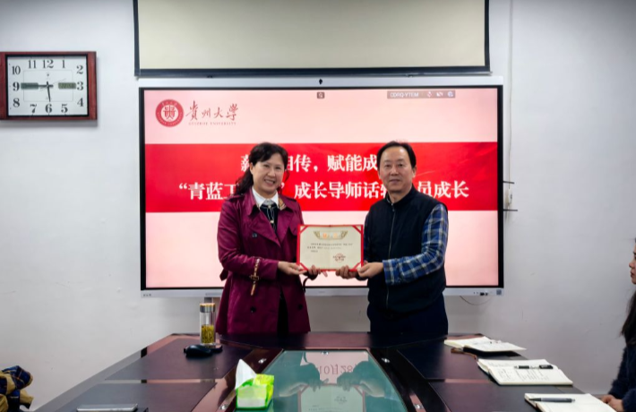 培训会后,学院党委书记罗聃宁为金春雷老师颁发“青蓝工作坊”成长导师聘书。