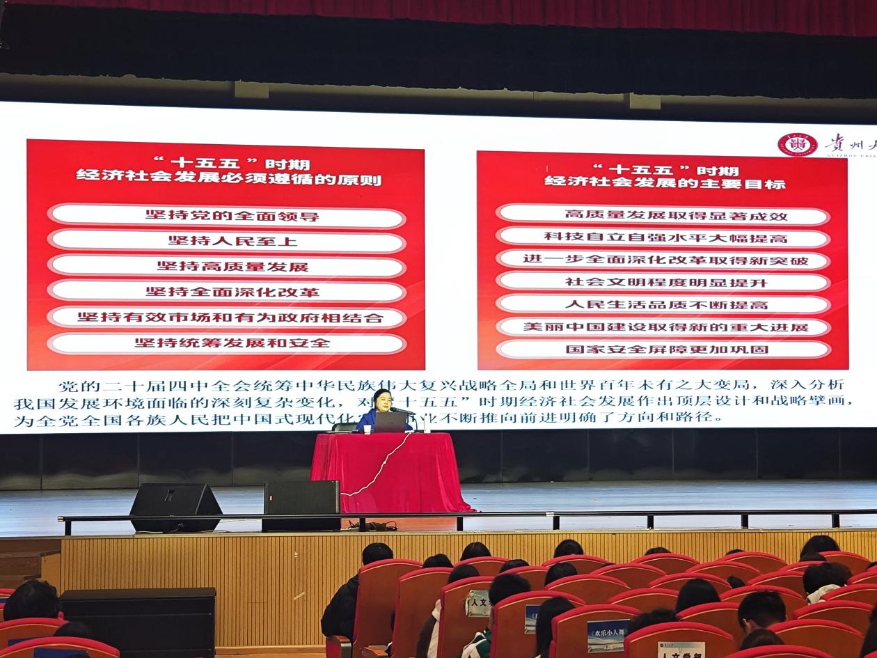 中国共产党第二十届中央委员会第四次全体会议于2025年10月20日至23日在北京举行,这次会议是在“十四五”规划收官之年、“十五五”规划谋划之年召开的一次具有里程碑意义的重要会议,会议主要议程为审议并通过《国民经济和社会发展第十五个五年规划建议》,为未来五年中国社会发展布局指明方向。值此重要节点,10月30日上午,贵州大学党委书记杨未教授到南校区大礼堂为阳明学院学生开展以“聚焦发展成就 锚定未来方向”为主题的形势与政策课,授课教师及学生200余人现场聆听。