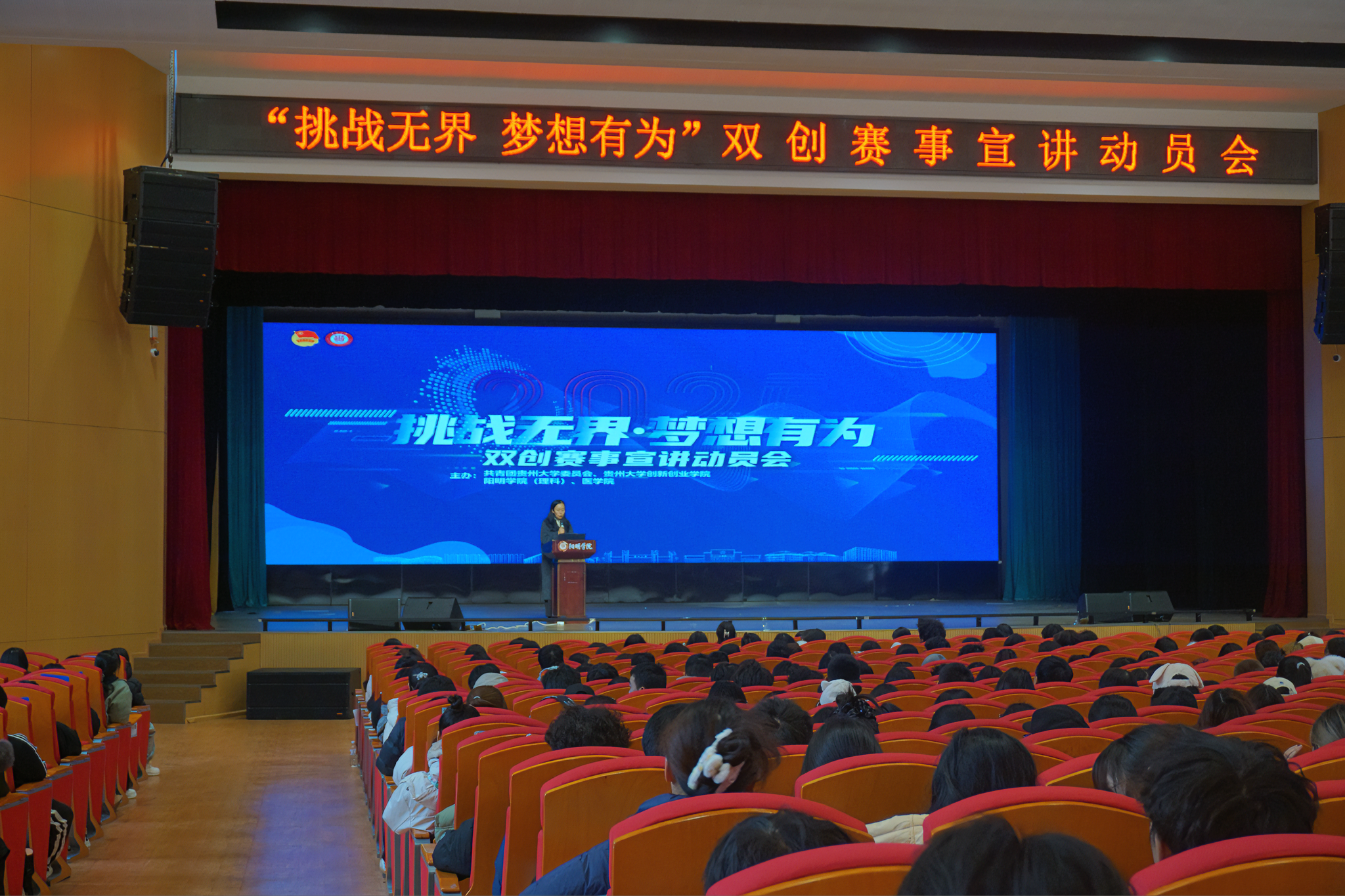 2025年 12月25日,“挑战无界·梦想有为”双创赛事宣讲动员会暨寒假实践研修计划启动仪式在南区大礼堂举行。本次动员会旨在以实践赋能、以研修提质,鼓励学生积极参与双创竞赛,营造以赛促学、知行并进的良好氛围。阳明学院、医学院师生代表共同参加了会议,本次活动分为理科场和文科场,动员会分别由阳明学院副书记李云、团委书记喻立主持。