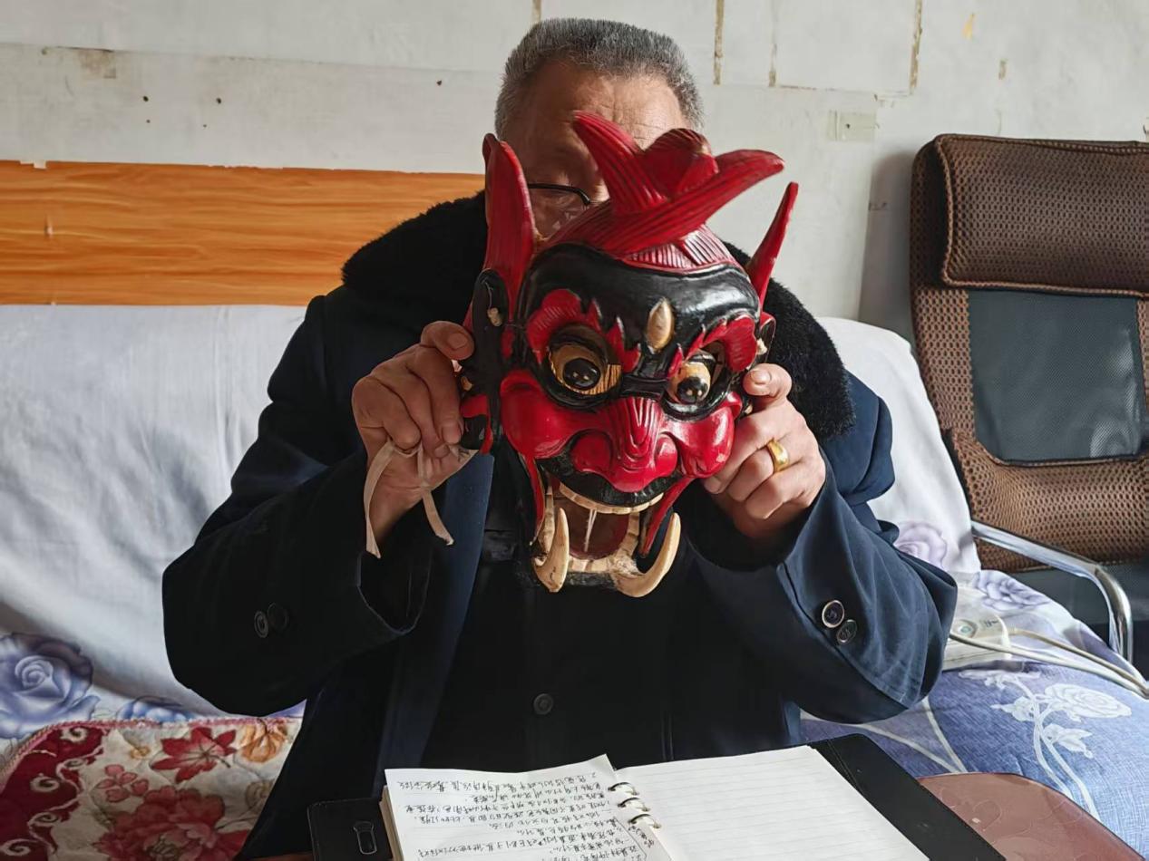 真正的文化寻根,始于与传承人的深度联结。团队多次探访国家级非物质文化遗产傩戏(仡佬族傩戏)传承人杨朝忠老人,在暖意融融的火塘边,老人取出半成品“活口面具”,指尖牵动牛皮绳演示其中机关,将抽象的技艺变得可触可感。谈及传承,老人追忆师傅的教诲:“你别怕,你要写书你就写,多一句我给你删,少一句我给你添。”这份师徒相授的笃定,让千年技艺的传承脉络愈发清晰。队员们围绕老人从艺史、傩戏源流及核心技艺深入交流,触摸面具粗糙肌理下的温润质感,在言传身教中承接厚重的文化记忆。