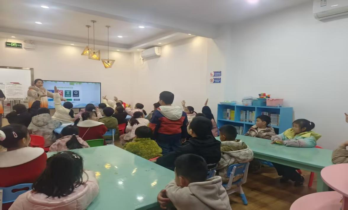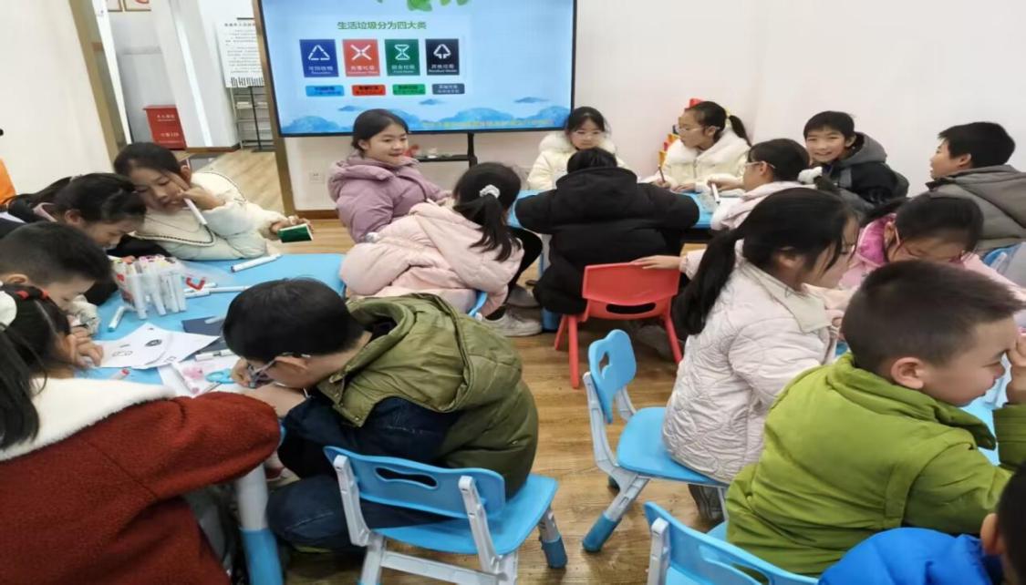 环保主题课堂上,实践队员带领孩子们通过大屏幕系统学习垃圾分类知识,从分类标准到实践意义,层层讲解让环保理念入脑入心。随后的手工环节里,孩子们拿起画笔和纸杯,亲手绘制垃圾桶标识,将所学的环保知识融入创意创作。大家围坐一堂,边做边聊,在欢声笑语中将绿色理念画进作品、刻入心中。此次活动让“绿色低碳”的种子在孩子们心中落地生根,引导孩子们从小树立环保意识,争做生态文明的小小践行者。