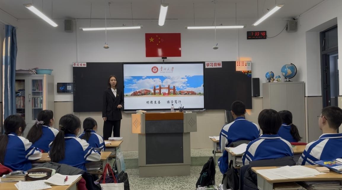 实践期间,张楚依还深入绥化市第一中学,以学姐的身份开展招生宣讲,她向高三学子详细解读贵州大学的办学特色、学科优势与招生政策,分享自己在贵大的学习生活与成长感悟,从优秀传统文化浸润到专业课程学习,从校园活动体验到就业发展前景,全方位展现贵州大学的独特魅力。同时,她还鼓励家乡学子在山水之间追逐梦想,促进区域教育交流互鉴。