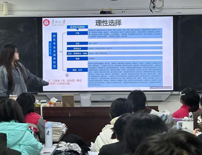 结合高中生生涯规划需求,宣讲团详细解读了贵州大学的育人实力。重点推介了“红映溪山”思政品牌和“博士村长”计划,展示了贵大学子把论文写在祖国大地上的生动实践。针对招生政策、优势学科(如理工农医的特色专业)及校园文化生活进行了详细说明,发放招生宣传手册,为高中生搭建了通往大学的“信息桥”。
