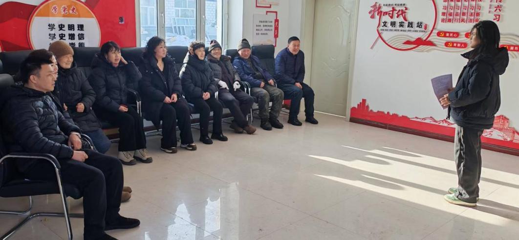 千里冰封的北国冬日,挡不住法治传递的温情。在黑龙江省佳木斯市同江市临江镇临江村文化活动室,张佳怡同学站在乡亲们面前,乡亲们围坐整齐,认真聆听。