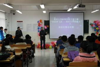 12月12日中午,贵州大学阳明学院工学三部“青春梦飞扬——我的大学我做主”演讲比赛总决赛在贵州大学南校区致知楼多媒体教室204隆重举行。阳明学院工学三部辅导员曹政老师首先介绍了担任此次演讲比赛的评委:阳明学院党委副书记王平判老师,阳明学院团委书记邓琳老师,阳明学院党政办刘凤霞老师,阳明学院通识教学部朱小明老师和阳明学院教务办周美林老师。