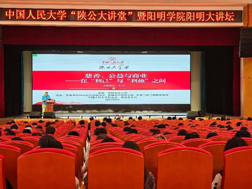 2025年9月29日上午,由中国人民大学主办,贵州省中国人民大学校友会、贵州大学阳明学院、贵州兰和兰律师事务所、中国人民大学校友会、教育基金会承办的中国人民大学陕公大学堂暨阳明学院阳明大讲坛第168期在贵州大学南校区大礼堂开讲。本次活动特邀中国人民大学国际关系学院李石教授作主题为“慈善、公益与商业 ——在“利己”与“利他”之间 ”的专题讲座。李石教授长期从事国际关系、全球学等领域的研究,曾获“全国建功立业先进个人”“全国三八红旗手”等荣誉。是国际正义研究中心研究员、中国社会科学院哲学研究所伦理学研究室副研究员,同时担任全国政协委员、民盟中央委员等职务。讲座由贵州省中国人民大学校友会会长张寒松教授主持。阳明学院540余名学生代表现场聆听了报告。