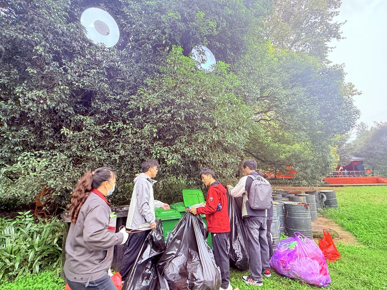 祭扫宣誓仪式结束后,志愿者们前往开展环境卫生清扫工作。大家以5~7人小组为单位,携带清洁工具分工协作:部分志愿者协助环卫工阿姨归集散落垃圾、清运装满的垃圾桶,减轻一线劳动者工作负担;其余志愿者俯身深入草坪绿地,细致清理隐藏在草丛中的烟头、包装袋等细小垃圾,同时对道路两侧、湖边步道的果皮、纸屑、塑料瓶等各类垃圾进行全面捡拾。清扫过程中,志愿者们严格按照可回收与不可回收标准分类投放垃圾,始终坚守文明作业准则,