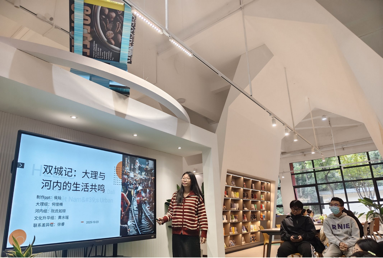 最令人印象深刻的是中越学生的联合展示。中国学生深情讲述大理苍山洱海的生态智慧与扎染工艺的手作之美,越南留学生则分享了河内的市井生活与文化传统。这场跨越国界的对话,不仅增进了文化理解,更引发了在场师生对“慢生活哲学”的深入思考。