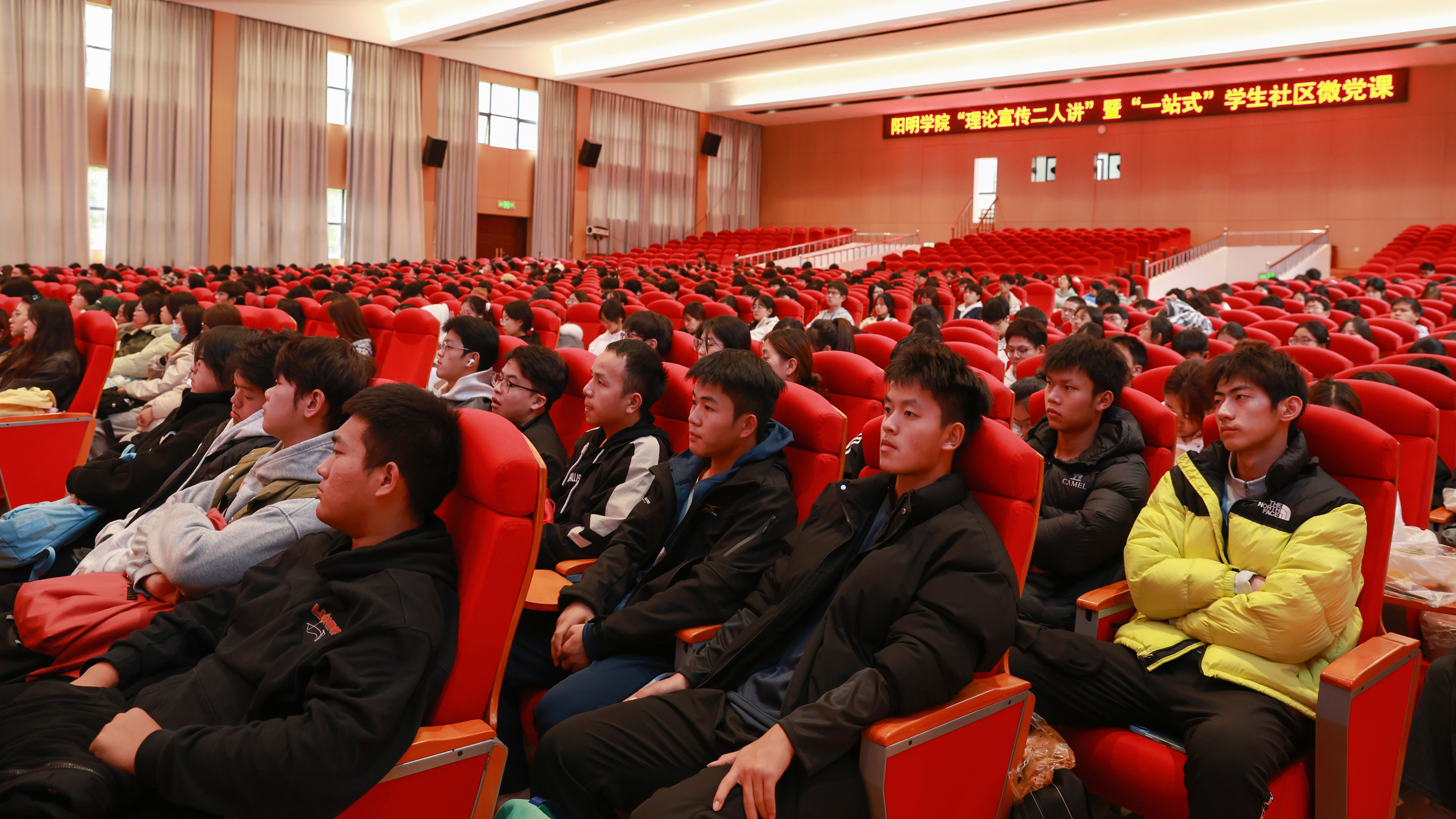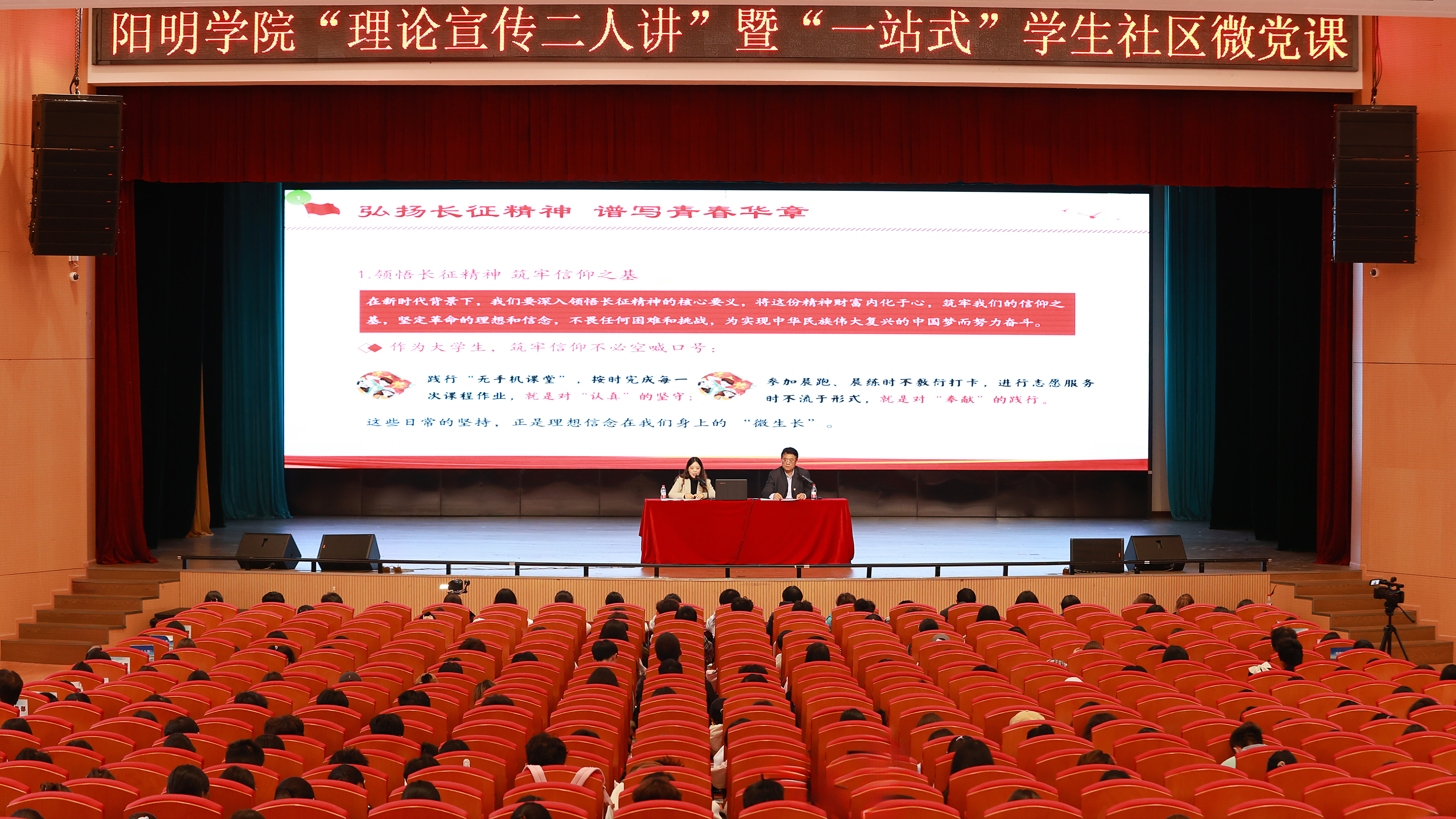 为深刻领会长征精神的丰富内涵,汲取前进的智慧和力量,引导大一新生筑牢信仰之基,争做时代先锋,走好新时代的长征路。11月6日中午,阳明学院围绕“弘扬伟大长征精神 谱写无悔青春华章”的主题,在南校区大礼堂开展“理论宣传二人讲”暨“一站式”学生社区微党课。学院正处级组织员叶明,校辅导员“传习社”宣讲员、院学务办主任王爽担任主讲,学院600名学生到场聆听。