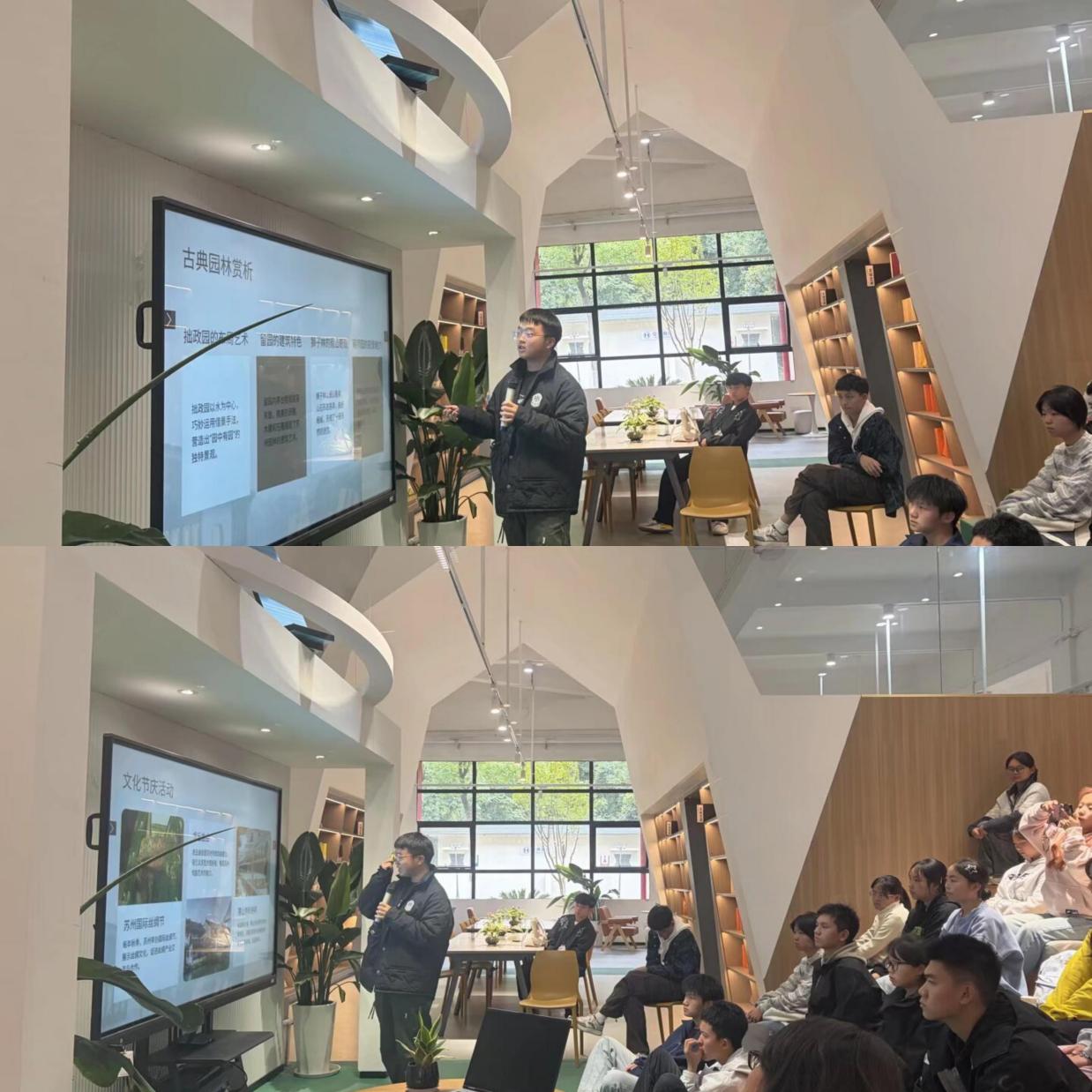 随后,同学们以“一座园林的变迁”为缩影,解析了苏州这座城市的繁荣密码。他们以拙政园为例,详解其如何以水为中心,通过廊、窗、石进行“咫尺之内再造乾坤”的空间叙事,并指出这种古典美学正潜移默化地影响着苏州工业园区现代建筑的设计哲学,体现了古今精神的交融。