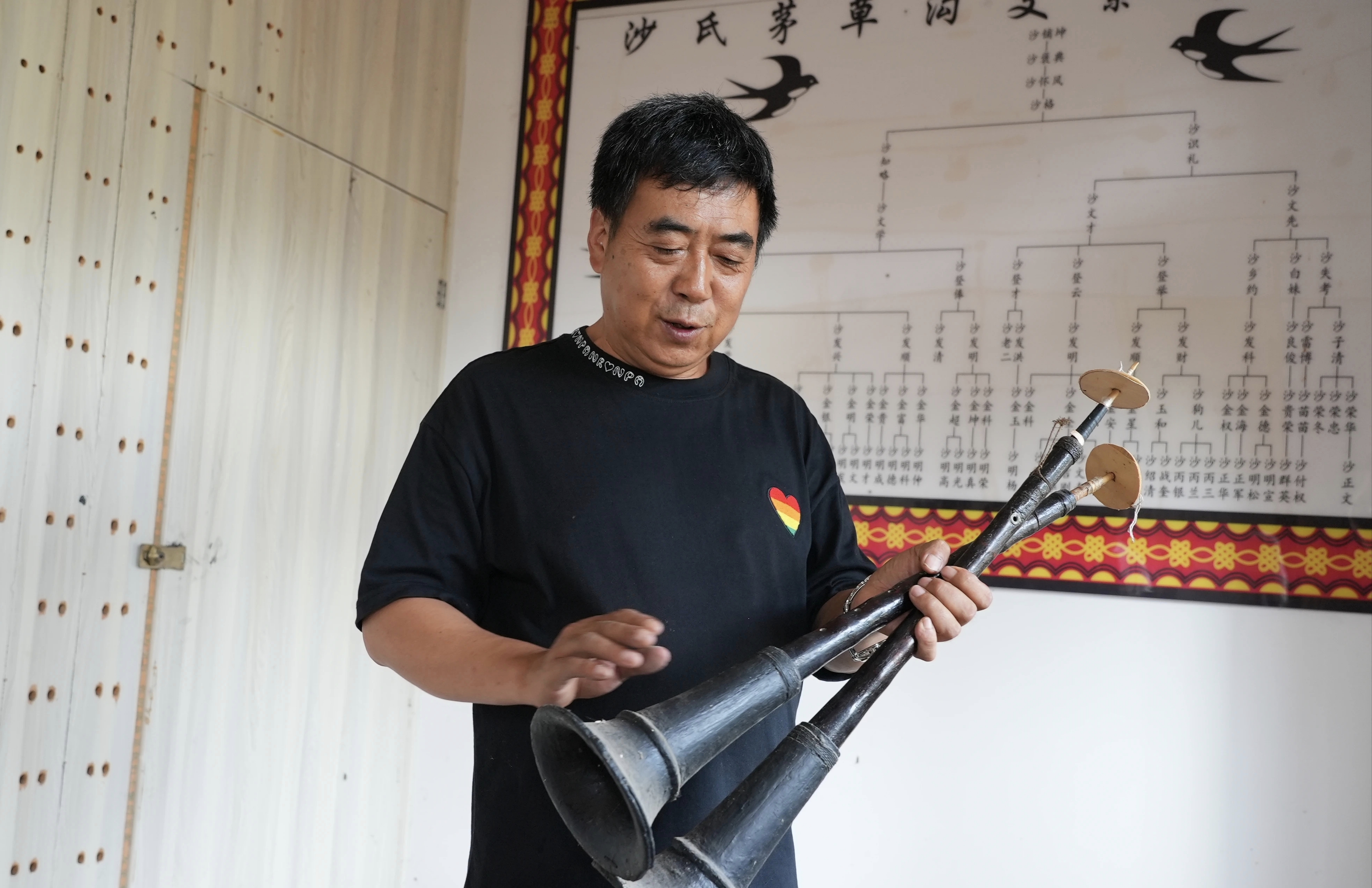 言传身教中,我们触摸到莫轰文化的厚重底蕴。沙汝杨先生初见便满含热情,将自己多年来对莫轰文化推广的期盼娓娓道来,那份想让更多人知晓、了解莫轰的赤诚,令人动容。作为莫轰传承的核心力量,沙先生见证并推动着莫轰的发展:曾经的莫轰,舞台囿于丧葬祭祀,吹奏曲调多为忧调,喜谱更是沙家独门技艺,传承范围有限;而如今,在以沙先生为代表的传承人的坚守下,莫轰的生命力不断延续。普宜镇乐都、道角等村寨近百位莫轰吹奏艺人,成为传承队伍的坚实力量,他们以口传心授的方式,将彝族先民赋予莫轰的音律密码,代代传递下去。沙先生的讲解与演示,让抽象的吹奏技艺变得可触可感,我们在聆听与观摩中,读懂了莫轰背后彝族人民的生活智慧与文化情怀,也承接起这份沉甸甸的文化记忆。