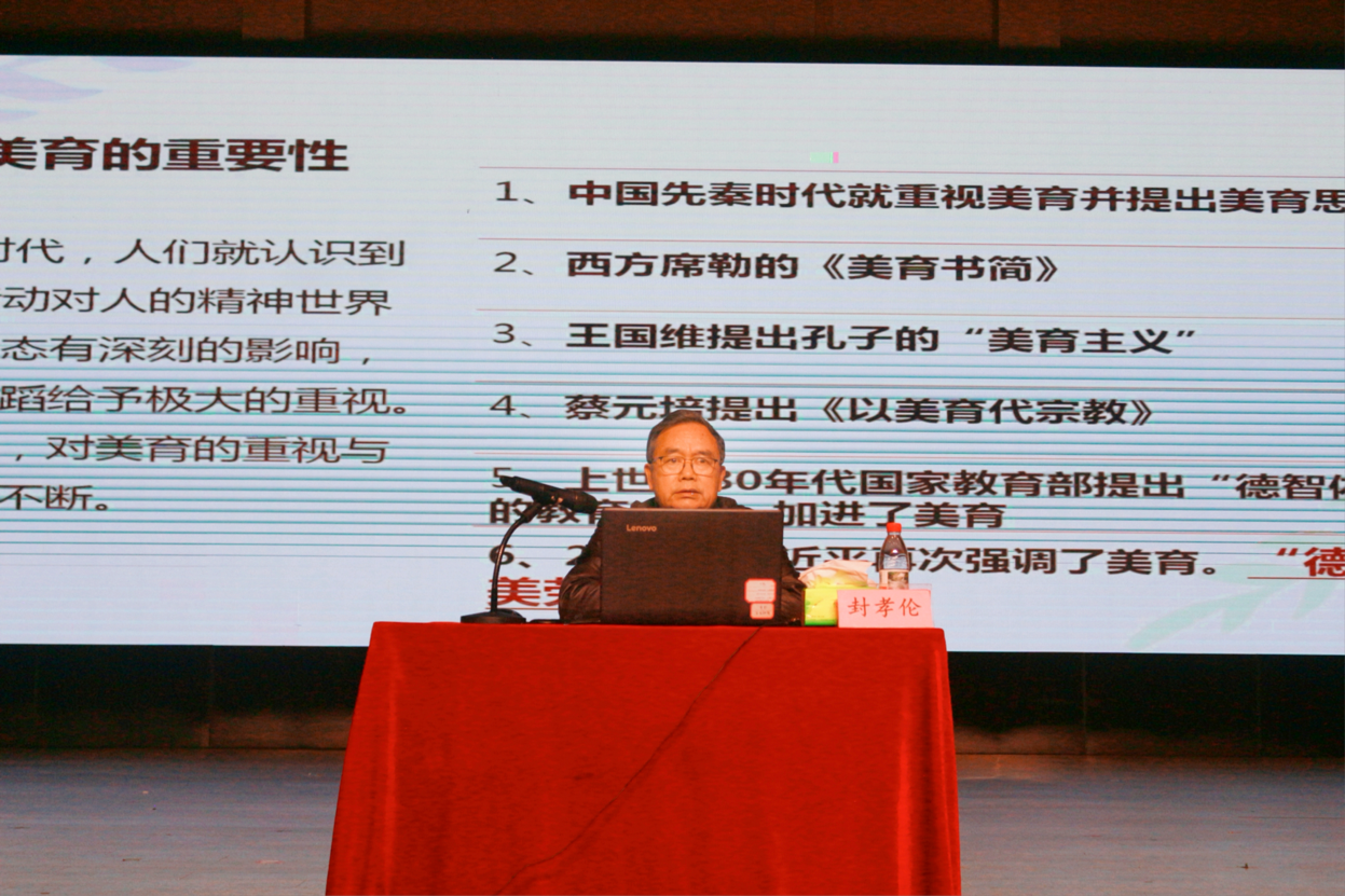 封孝伦教授长期深耕美学理论研究,出版《二十世纪中国美学》《生命之思》等专著,构建了当代生命美学理论体系,是该领域领军人物。讲座开篇,封孝伦教授系统梳理了美育的发展脉络与时代价值:从中国先秦礼乐教化、西方席勒《美育书简》,到王国维、蔡元培的美育思想,再到国家“德智体美劳”五育并举的育人方针,深刻阐释了美育在立德树人、塑造健全人格中的核心作用。他明确了美育在教育体系中的分工定位:美育承担着审美启蒙、情感培育、精神滋养的独特使命,是串联五育、实现育人融合的重要纽带,与德育、智育、体育、劳育相辅相成,共同构建完整育人体系。