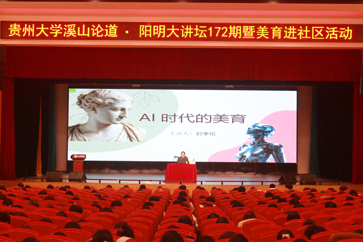 为丰富校园文化氛围,营造沉浸式美育环境,3月24日晚,“溪山论道·贵州大学阳明大讲坛”第172期暨红烛絮语·桑榆讲堂第4期在南校区大礼堂如期开讲。本次讲坛以“AI 时代的美育”为主题,特邀国务院特殊津贴获得者、贵州省省管专家封孝伦教授担任主讲嘉宾,讲座由贵州大学阳明学院院长段忠贤主持,阳明学院800余名学生代表现场聆听了报告。